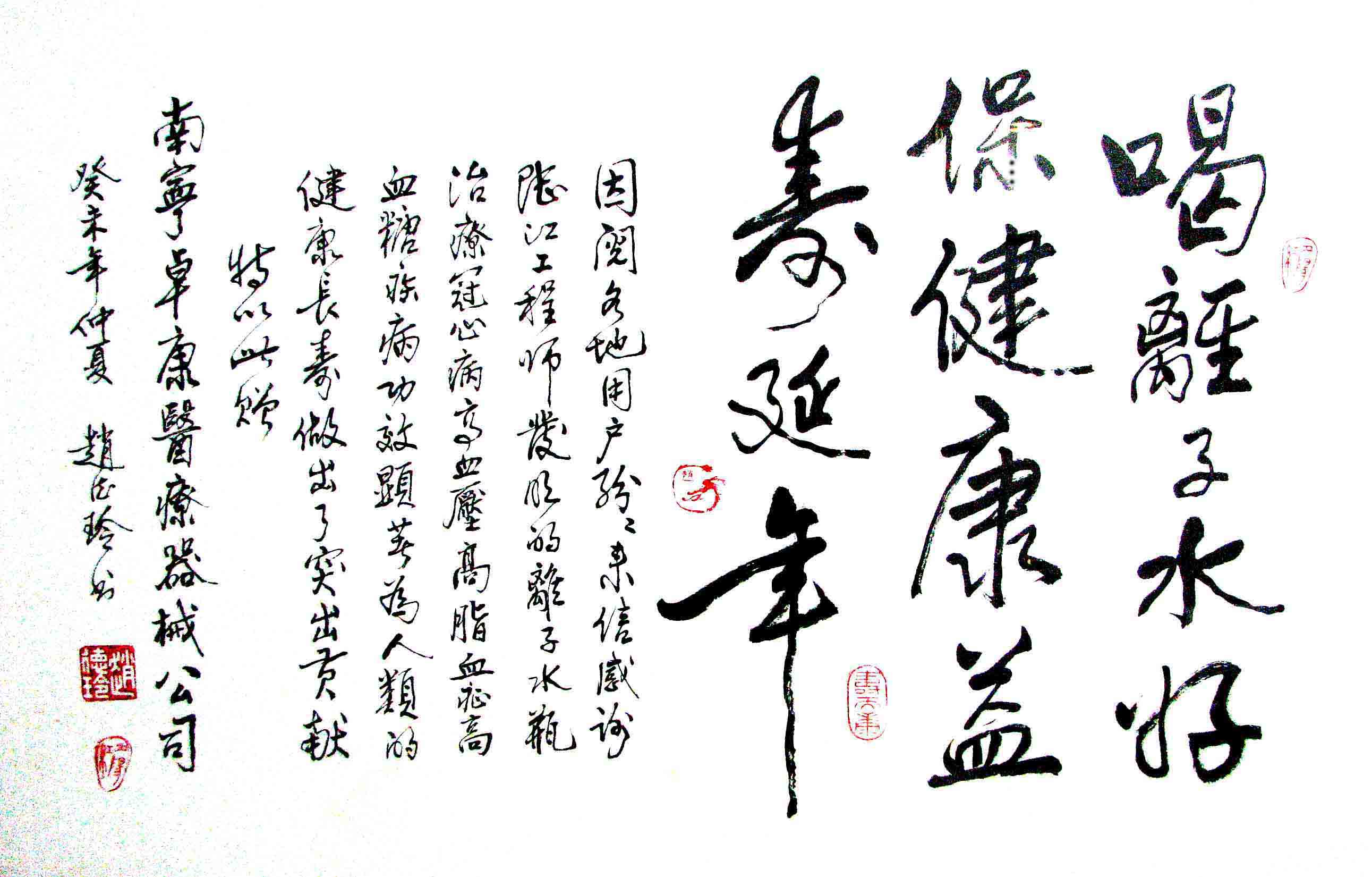 - -- 幾千年來,人類靠醫(yī)藥不能根治冠心病、高血壓和糖尿病,如想根治,那是夢想。可是,我從中國基礎醫(yī)學研究成果受到啟發(fā),研發(fā)了一種發(fā)明產品,處理出微小分子團水讓人飲用,實現了人類這一夢想!患者飲用后遠離了冠心病、高血壓和2型糖尿病。這一成果曾經過臨床試用和專家鑒定,作為準字號醫(yī)療器械讓廣大患者飲用,療效進行跟蹤調查。很多患者的反饋情況令人感動,我放在公司網站上(nnzk.com),震撼了醫(yī)學專家,也使廣大同胞受到啟發(fā)。人們盼望飲用它給細胞補水,治愈多種病癥,既省錢,又安全,而且延長壽命。