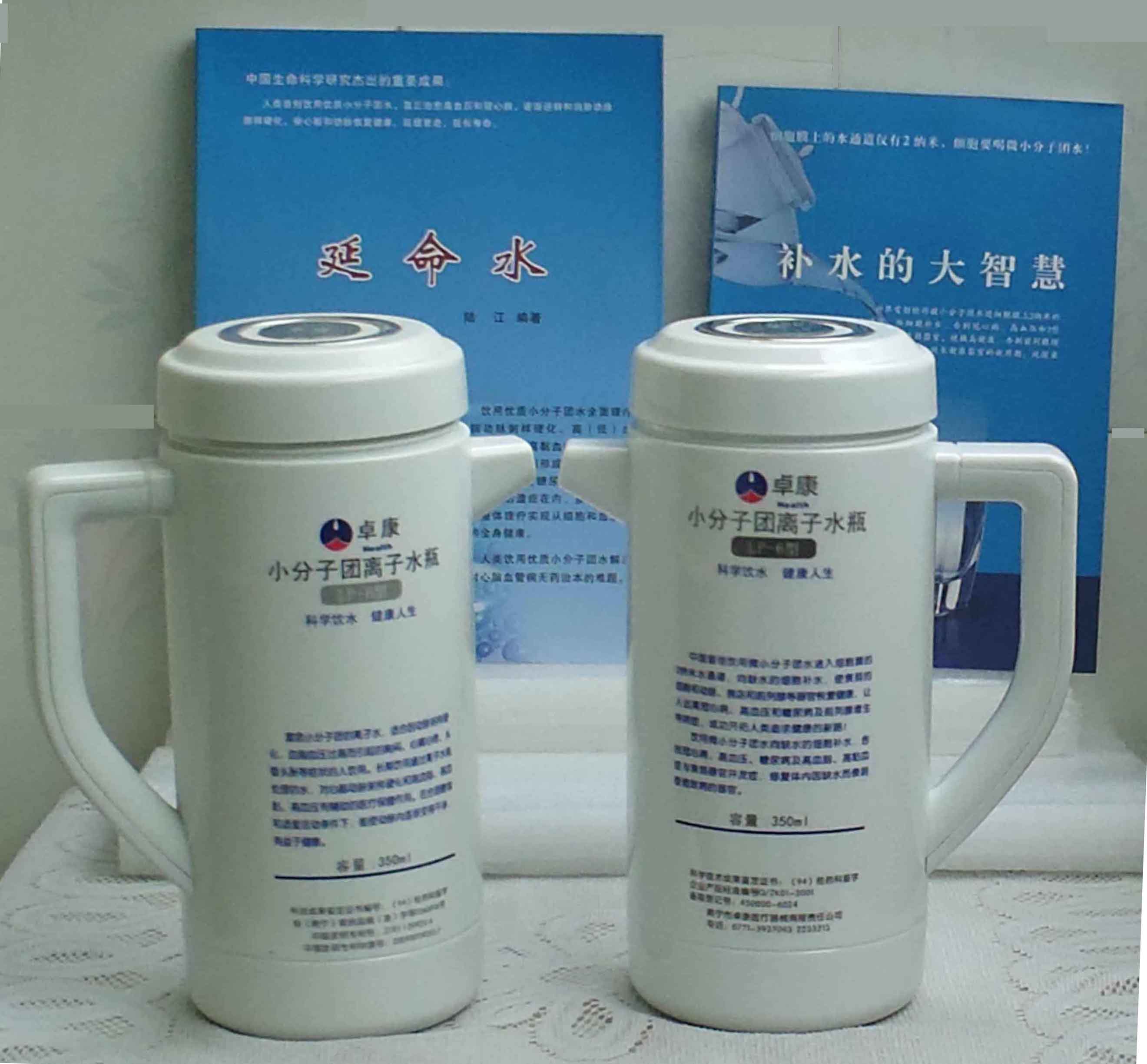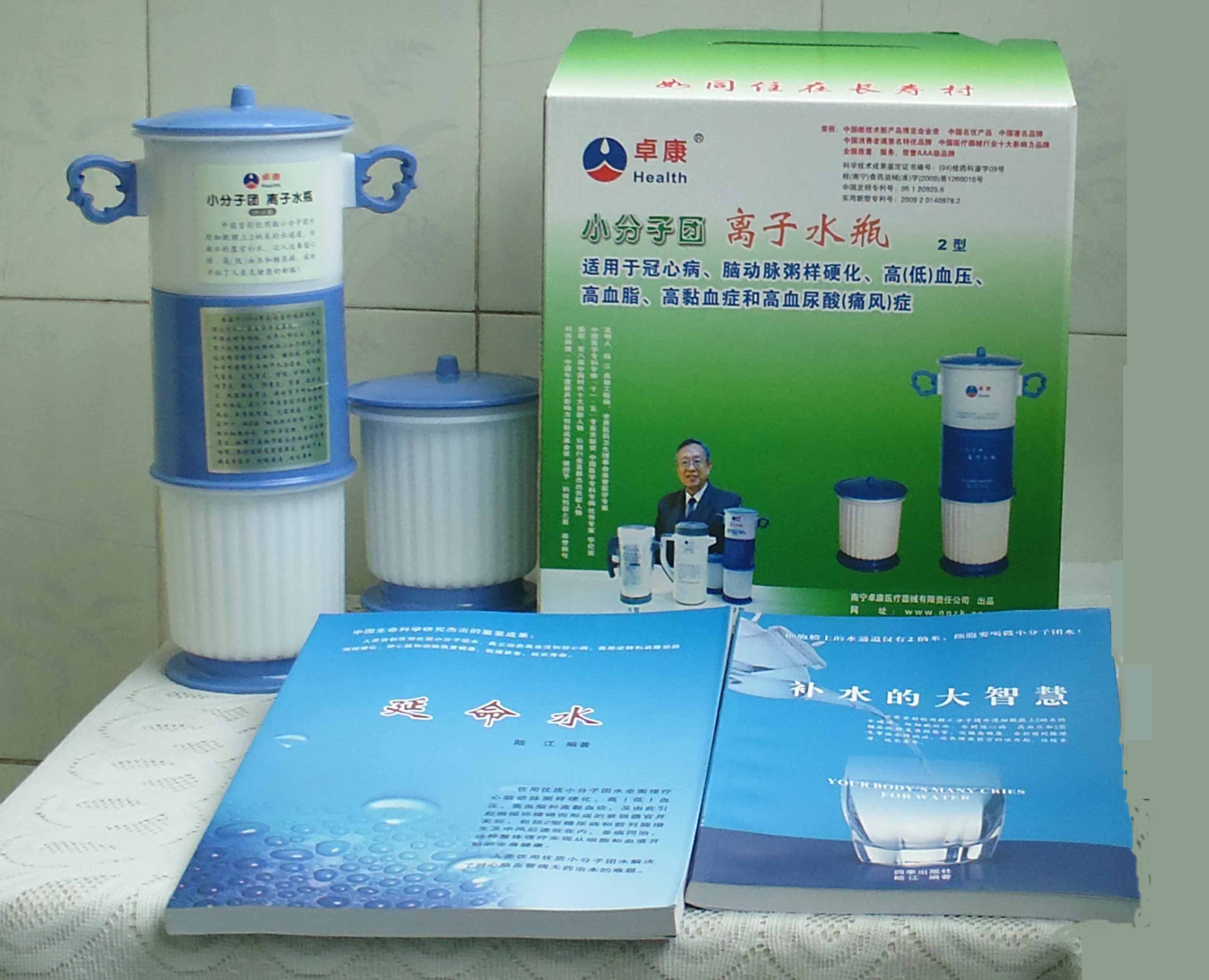 本品大量用戶的使用效果表明,能治愈冠心病、腦動脈硬化、原發(fā)性高(低)血壓、高血脂、高粘血癥、高血尿酸癥(痛風)和2型糖尿病、衰弱器官并發(fā)癥(前列腺增生、腎衰與尿毒癥)及中風后遺癥等療效好。產品配信譽卡。使用壽命30年,不換芯,易清洗。團購優(yōu)惠。從郵局匯款,匯費1%,地址按本頁下方地址、聯系人寫。從銀行匯款,請點擊[聯系匯款]欄,從工商銀行匯款,建設銀行、農業(yè)銀行匯款,均免收匯費,匯款后20--30分鐘內發(fā)短信,可用微信轉帳,均免匯費,微信號即手機號13768308380。匯款后,告知你的姓名和地址,我公司聯系人手機號是:13768308380卓康牌離子水瓶為我公司獨家生產,郵購產品配《補水的大智慧》彩印書一本,另配四季出版社出版的新書《補水的大智慧》一本,并配光盤一張(含央視主持人釆訪陸江的對話視頻)。目前市場和"淘寶網"上有人兜售假冒的偽品,望讀者審察辯別真偽,造假者剽竊假冒本公司的各種證、獲獎獎項、專利號和外包裝盒上的中英文字,包括科技成果的鑒定意見等,請讀者注意防偽。如何識別假貨?已經買了假貨怎么辦?(請點擊[打假掠影][打假掠影])。