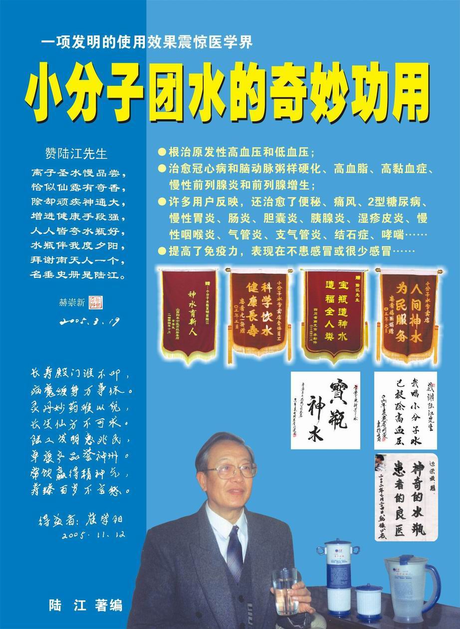 人類幾千年來患以上病癥需終生服藥,幾十年也不能治愈。可是我國南寧的高級工程師陸 江,于1990年想根治高血壓,研究發(fā)明了離子水瓶,處理出微小分子團水供飲用,經過醫(yī)院臨床試用和專家鑒定,1999年獲中國發(fā)明專利權,產品于2000年投放市場后一直跟蹤調查,據全國各地用戶反饋:祛除了高低血壓、糖尿病和冠心病,并使前列腺增生、咽喉炎、鼻竇炎、慢性氣管炎、支氣管炎、矽肺病、哮喘、慢性胃炎、腸炎、慢性膽囊炎、慢性腎炎、腎衰、膀胱炎、便秘、痔瘡、風濕性關節(jié)炎和濕疹皮炎及中風后遺癥等病癥不藥而愈。為什么喝微小水能治20多種病?陸 江從1991年德國科學家發(fā)現細胞膜水通道僅為2納米獲得啟發(fā),認為多種器官患病是因細胞脫水,不能正常代謝和分裂增殖,才使器官細胞減少致衰弱萎縮而形成細胞缺水性病癥。22年來的實踐有力地支持了“細胞脫水致病”這一重要論點,表明喝微小水可滿足細胞的生理需求,補水就能祛病,是生命科學新亮點。